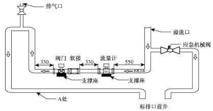 圖2中,溢流口出水后從高處往下,因為虹吸現(xiàn)象會將氣泡帶進流量計管路中,在U型彎的最高處安裝一個排氣口,溢流口和排氣口達到氣壓平衡,通過U型彎的擠壓在上升段中除去水中的氣泡,確保消減虹吸現(xiàn)象。此種方法較適合于重力流出水方式。為了確保企業(yè)安全生產(chǎn),需要精確地計算出排水管徑的大小,安裝一個應(yīng)急機械閥。