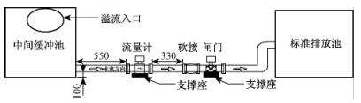 圖1中,溢流口出水后從中間緩沖池的高處流入,然后從池的低處流出經(jīng)過流量計,經(jīng)過向上的U型彎進入標準排放池。因為U型彎始終高于管路進口,水從U型彎流出必先填充滿管路,既保證了滿管,又提高了流量計的安裝精度。這種方法也較適合于重力/壓力混合流的出水方式。為了確保企業(yè)安全生產(chǎn),需要在溢流口安裝一個總閥,并精確地設(shè)定緩沖池體積、管口高度、管路直徑等。另外,為了方便清洗流量計,建議在管路底部安裝排污閥門。