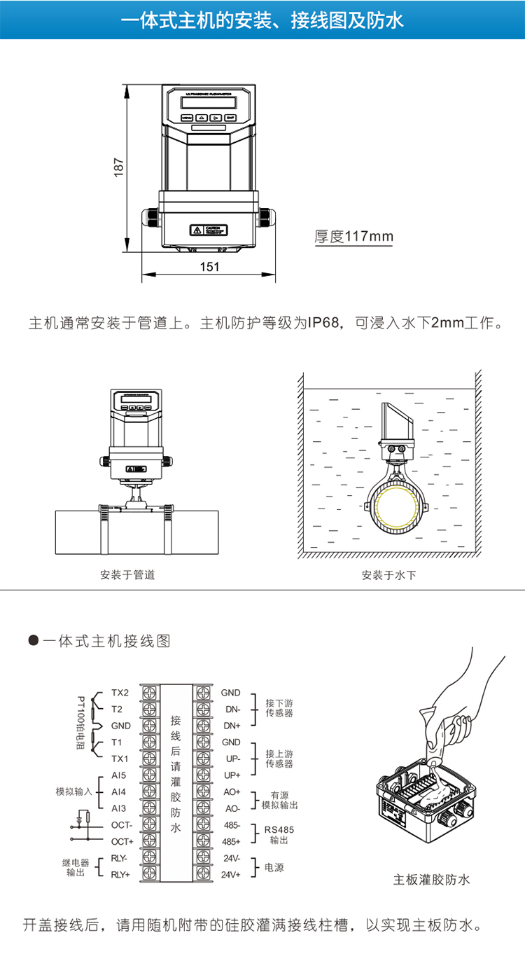 主機:85%RH;流量傳感器:可浸水工作,水深≤2m(注:傳感器灌膠后)