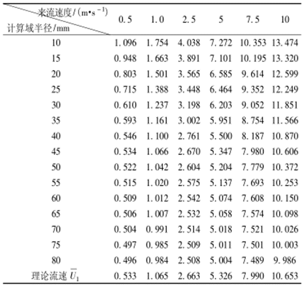 取計算域半徑在10~80mm的范圍內,通過GAMBIT軟件分別建立模型,再由FLUENT軟件分別進行仿真,得出在不同半徑的計算域內所對應的體積加權平均流速,如表1所示。