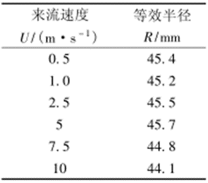 為了得到不同來流速度下的等效半徑,利用MATLAB對各組數(shù)據(jù)進行相應理論流速的插值運算,得到如表2所示的數(shù)據(jù)。
