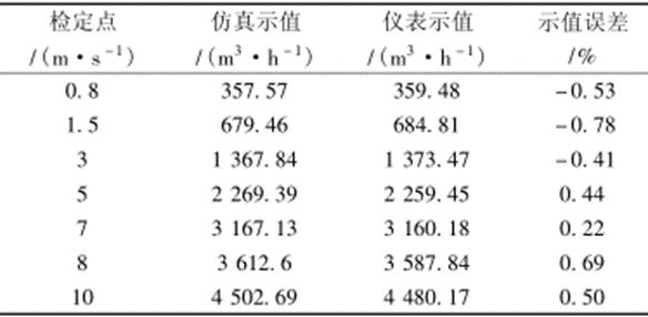 為了驗證通過上述方法所得到的插入式電磁流量計等效信號作用范圍的可靠性,把該尺寸的傳感器探頭形狀加工制作成流量計樣機在口徑為400mm的管道上進行流量測量,插入深度也保持在120mm。其測量得到的體積流量與仿真得到的流量進行對比,如表3所示,其中計算仿真流量示值所用的流速是上述得到的等效信號作用范圍內的平均流速