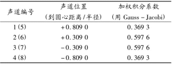 對(duì)于多聲道超聲流量計(jì),其每個(gè)聲道的積分加權(quán)系數(shù)是一個(gè)固定值,并且在國(guó)際電工委員會(huì)的IEC6041規(guī)程和美國(guó)國(guó)家規(guī)程ASMEPTC18中作了明確的規(guī)定。為了滿足各種不同流態(tài)分布測(cè)量的需要,多聲道流量計(jì)具有多種聲道布置,對(duì)應(yīng)每種聲道布置,積分加權(quán)系數(shù)都有確定的值。表1是國(guó)際電工委員會(huì)IEC6041規(guī)程關(guān)于4/8聲道超聲流量計(jì)的聲道位置和加權(quán)積分系數(shù)的規(guī)定值。
