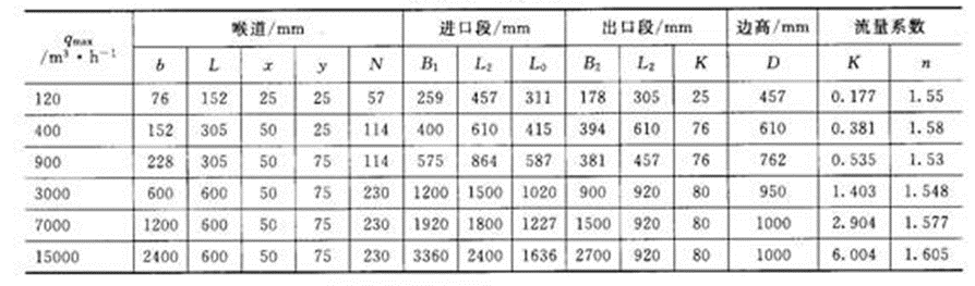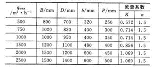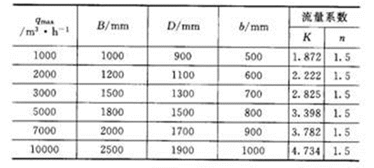 不同規(guī)格的槽或堰n、K值是不一樣的。使用和設計槽或堰必須參閱"明渠堰槽流量計檢定規(guī)程"(JJG 211-90)。這里僅給出一些三角形缺口薄壁堰、矩形缺口薄壁堰、等寬薄壁堰和巴歇爾槽的基本尺寸和K、n值,分別見表2~表6以及圖3~圖6。表6列出了各種槽堰可以測量的流量范圍。