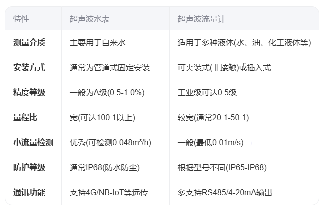 超聲波水表和超聲波流量計(jì)都是利用超聲波原理進(jìn)行流量測(cè)量的設(shè)備,但在設(shè)計(jì)、功能和應(yīng)用場(chǎng)景上存在顯著差異。以下是兩者的詳細(xì)對(duì)比:
