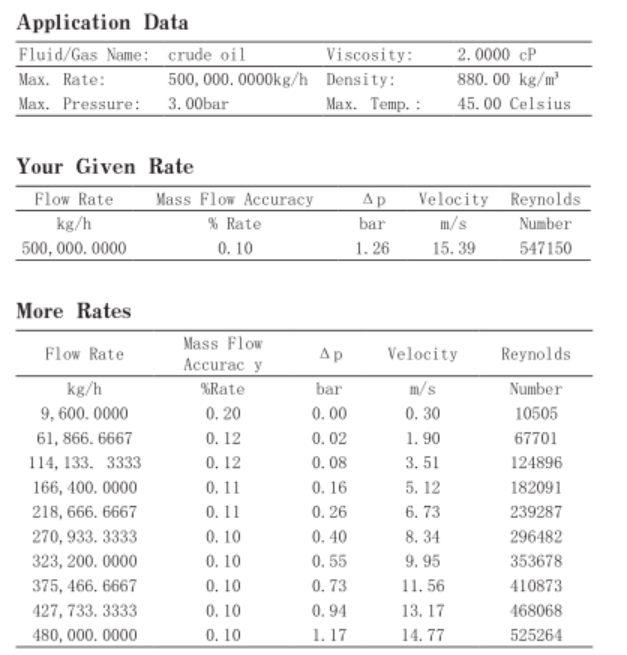 質(zhì)量流量計以科氏力氏質(zhì)量流量計(CMF)的應(yīng)用較為廣泛,是通過測量科里奧利力進行流量測量。按照上述工藝條件,選用質(zhì)量可靠的計量級質(zhì)量流量計,按照計量標(biāo)準(zhǔn)選用精度為0.2級。流量計的口徑選用DN200,得到質(zhì)量流量計的計算書如下: